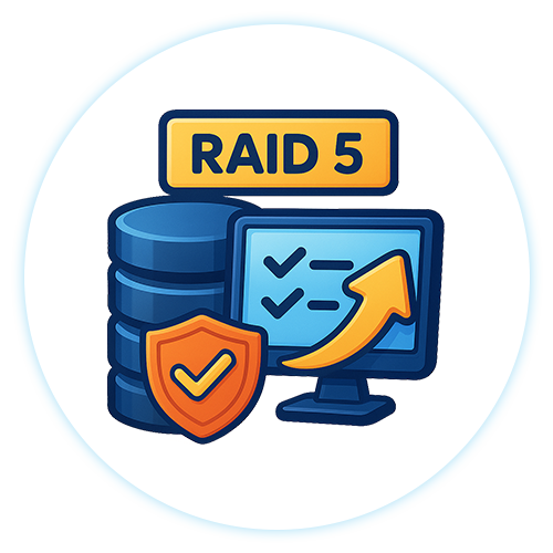 當 RAID 5 中任一硬碟資料損壞時,系統可透過其餘硬碟上的資料及校驗碼自動重建遺失內容,以確保資料完整性與系統運作不中斷。